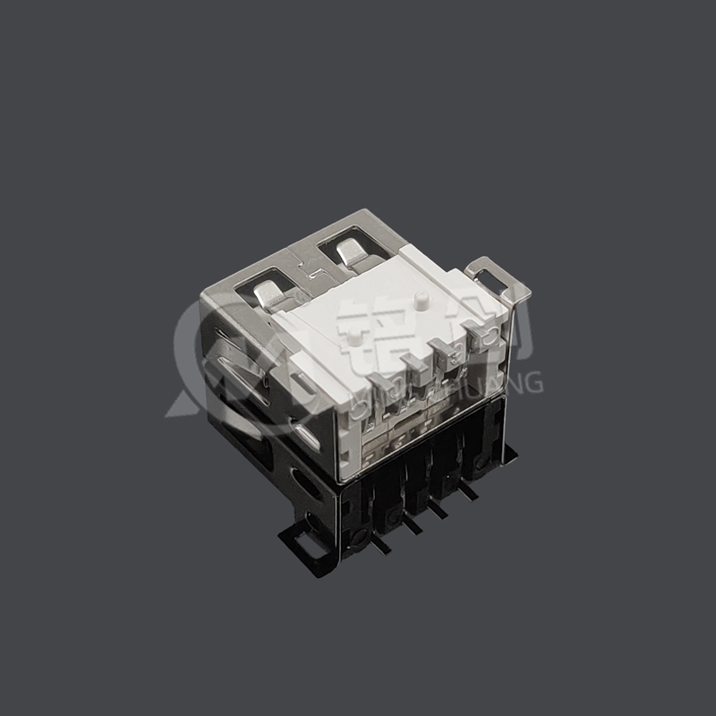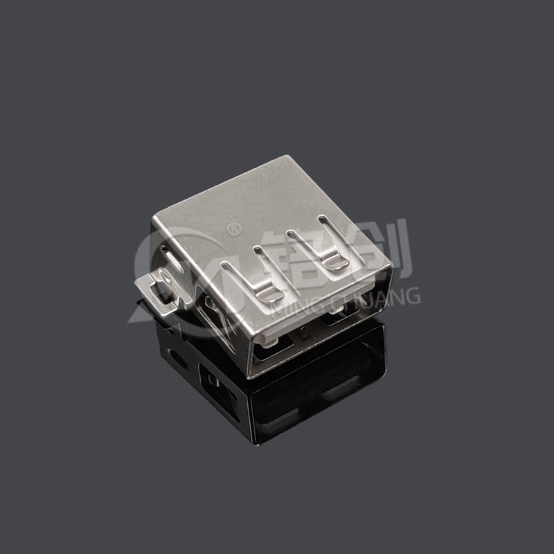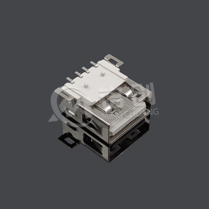 本产品为 USB 2.0 A 型母座,采用板上后两脚 SMT 贴板安装设计,适配 PCB 表面贴装工艺。1.0mm 直径定位柱确保安装精度,铁壳直边结构增强机械强度与 EMI 屏蔽能力。外壳选用 LCP 米黄色材料注塑成型,耐温达 280℃,兼具高强度与绝缘性,适用于消费电子、工业控制等场景,符合 RoHS 环保标准,支持 480Mbps 数据传输及 5V/0.9A 供电。
